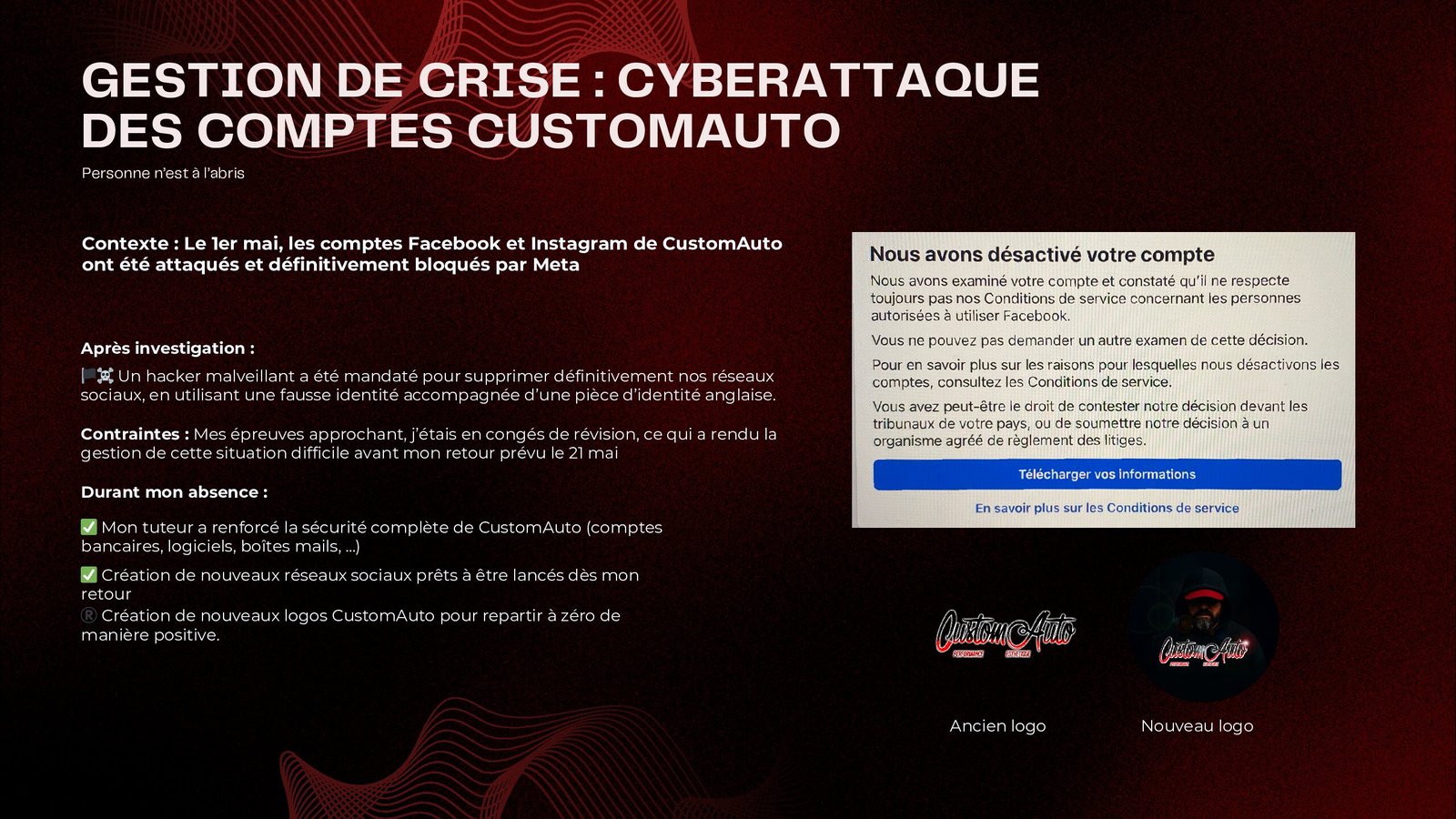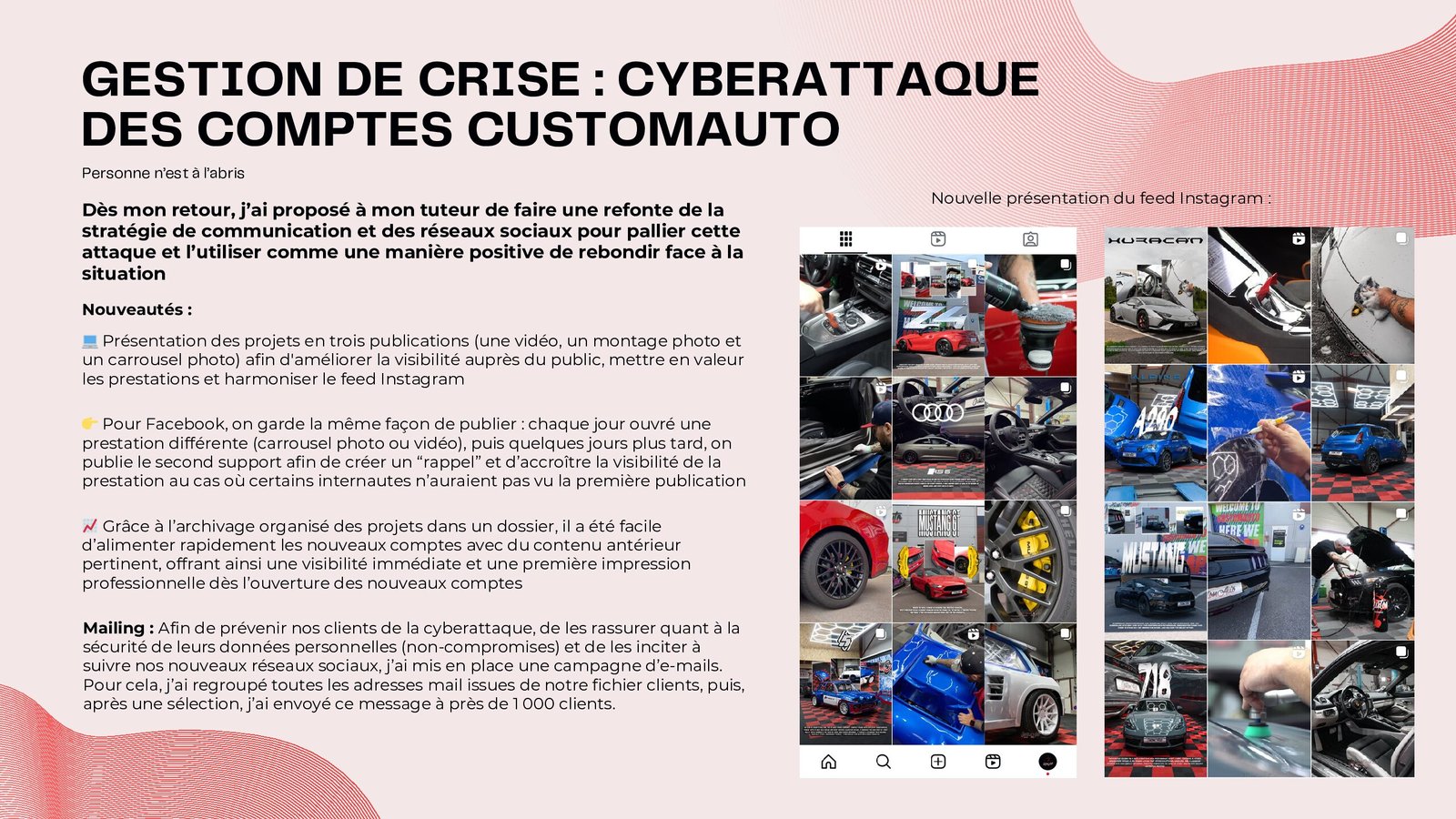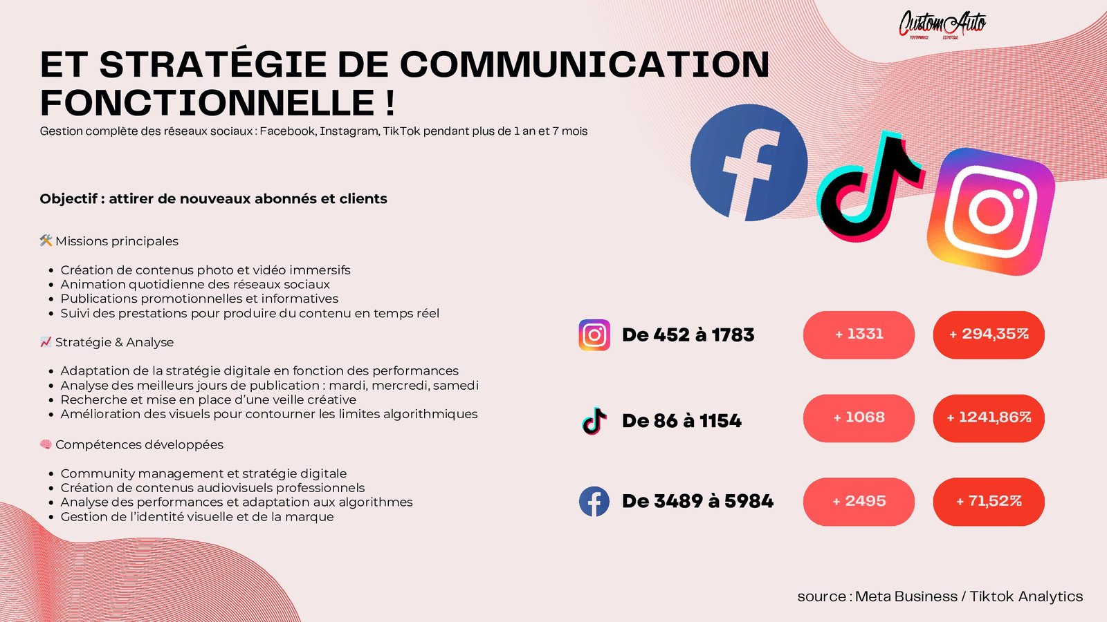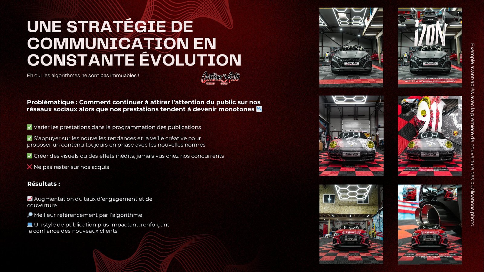 Mes réalisations en photographie et en vidéo, partagées sur les réseaux sociaux, ont progressivement accru ma visibilité, attirant ainsi l’attention d’un chef d’entreprise qui m’a proposé de le rejoindre pour développer la communication de son entreprise CustomAuto.